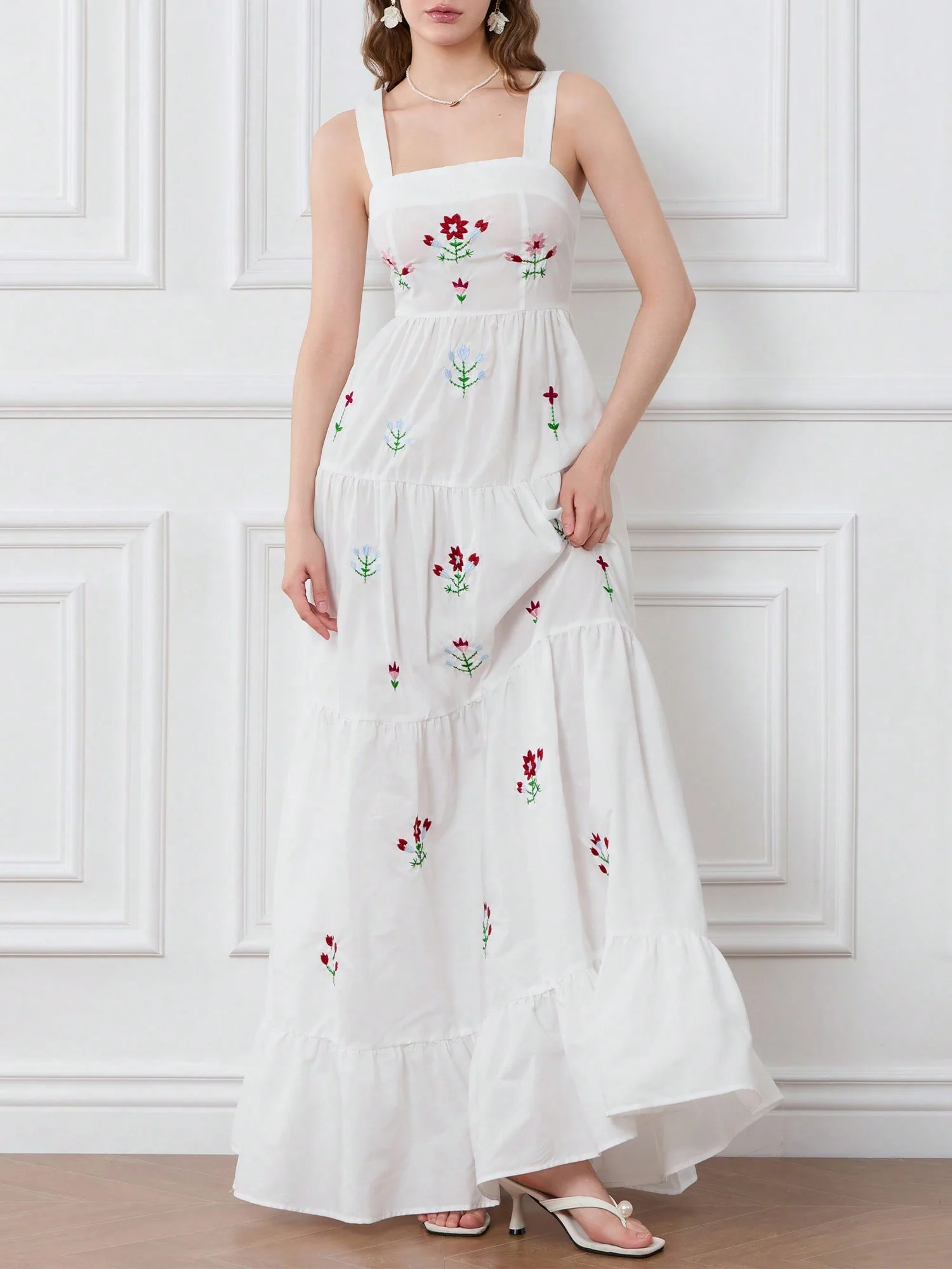 Women's Long Beach Dress Sleeveless Square Neck Embroidery Tiered Dress Midi Slip | ChicGrl